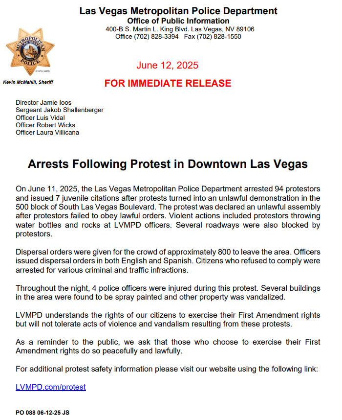 According to LVMPD’s press release, the protest—attended by an estimated 800 people—was declared an “unlawful assembly” after demonstrators allegedly threw rocks and water bottles, blocked roads, and ignored repeated dispersal orders issued in both English and Spanish. The department reported four officer injuries, along with vandalism to nearby buildings and property. A total of 94 arrests were made, alongside 7 citations issued to minors. LVMPD reiterated its support for First Amendment rights while maintaining a zero-tolerance stance on violence and vandalism.